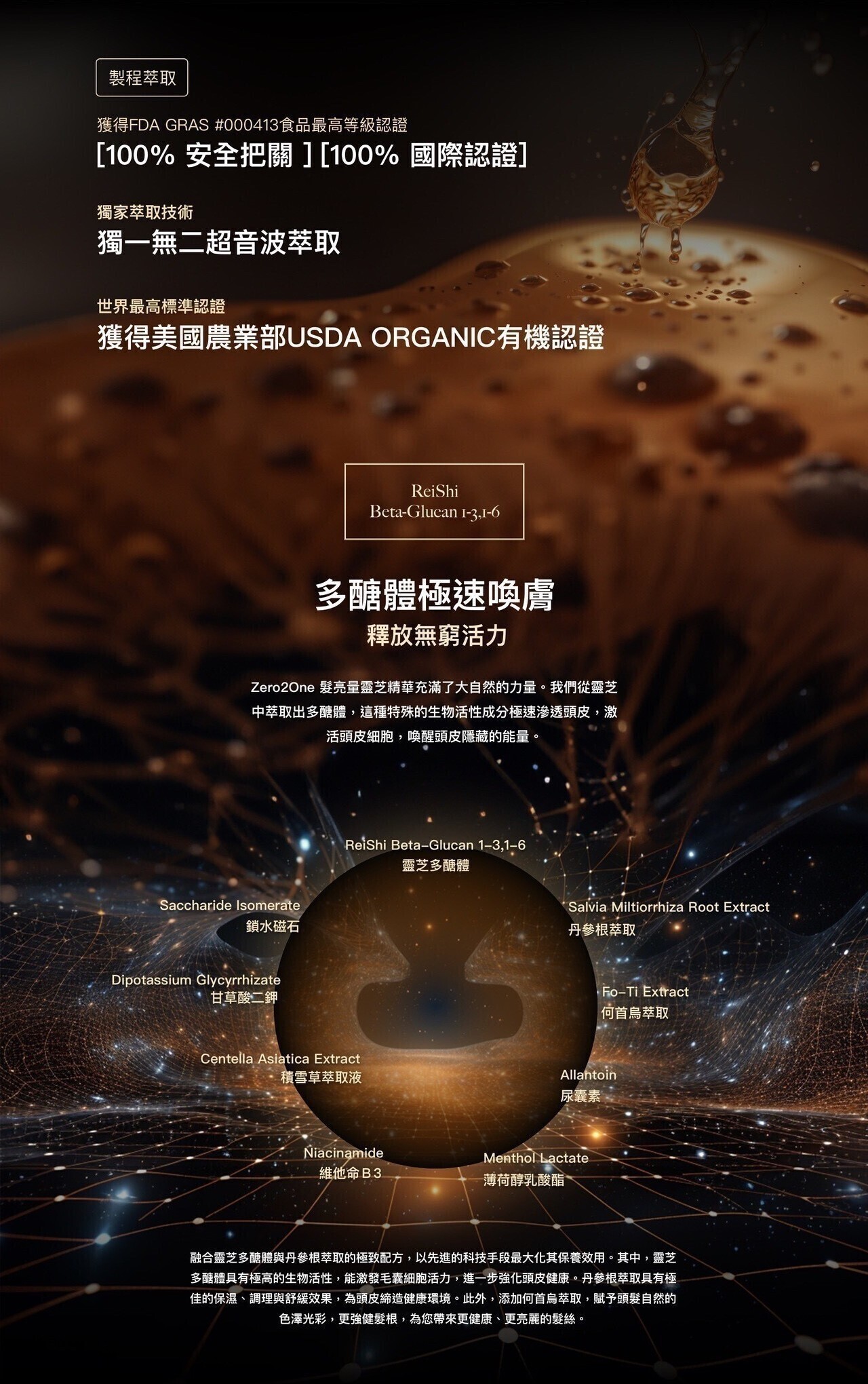 1.使用獨家研發超聲波萃取技術(分離過程無使用溶劑/無化學品/無乙醇/無熱水),精挑細選最優質的靈芝。使用的靈芝多醣體擁有美國FDA GRAS/USDA ORGANIC/HALAL/KOSHER 認證。