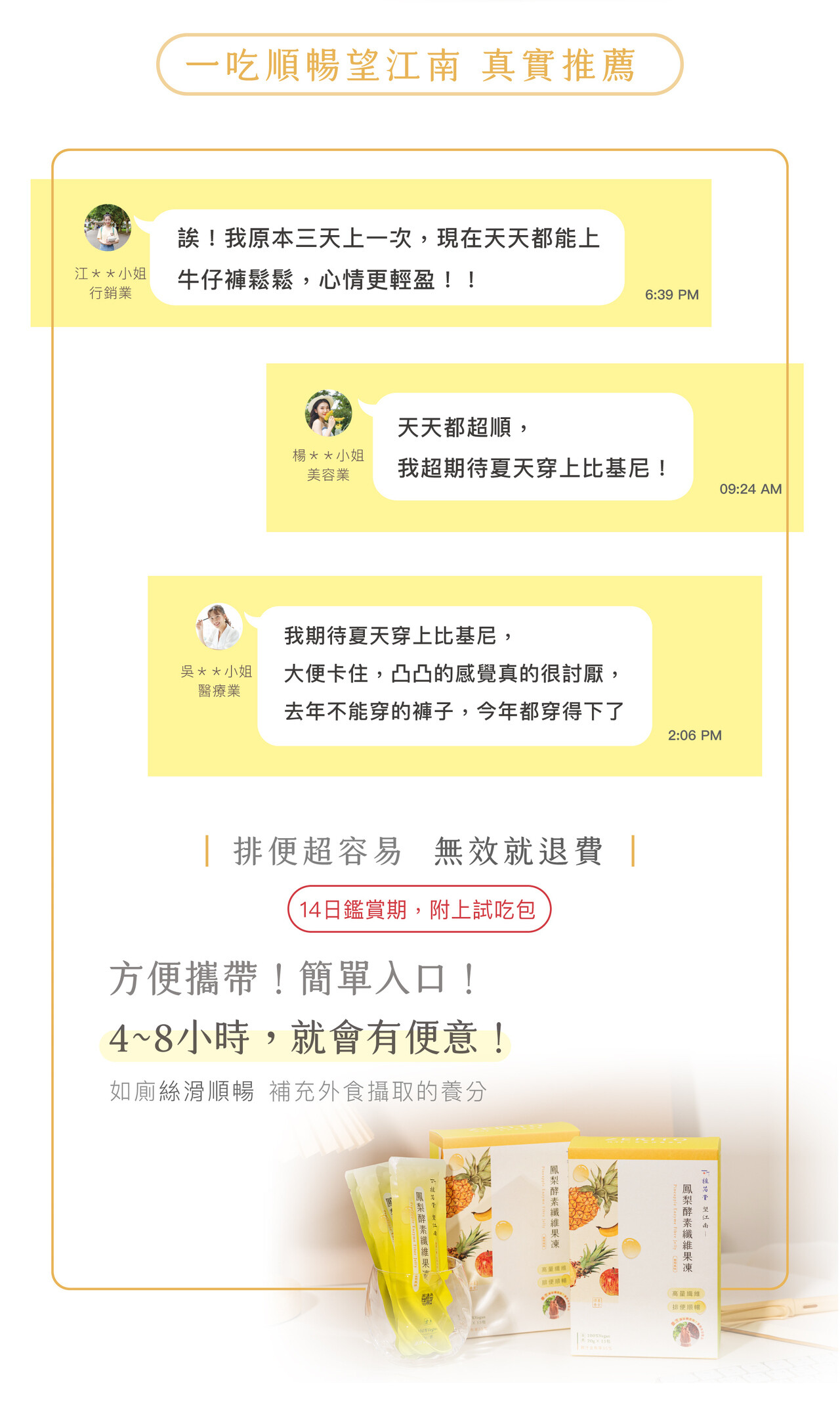 針對外食飲食不均衡,天天順暢設計的果凍,以保養品起家,產品以美容為出發點作為研發,營養的平衡與補充,搭配保養品增加3倍的效率