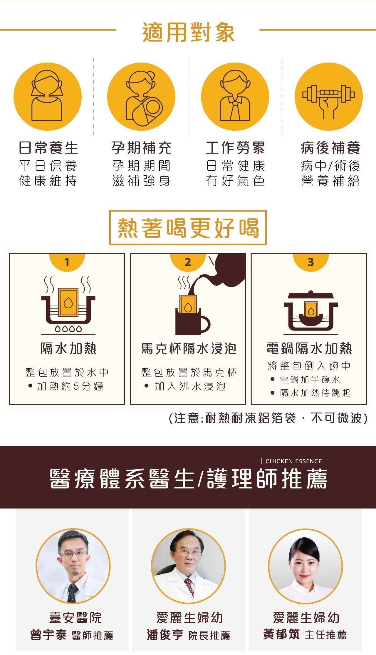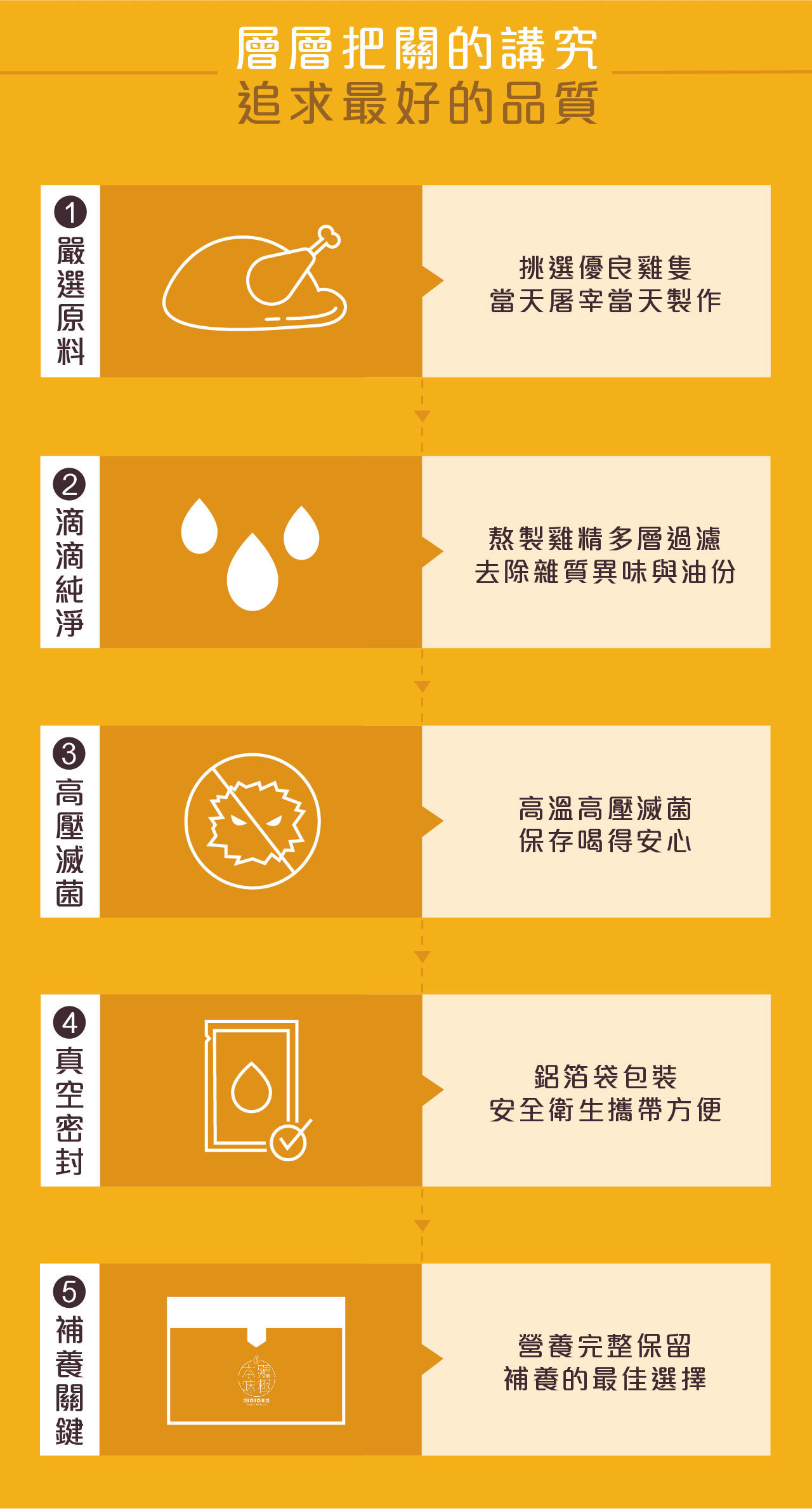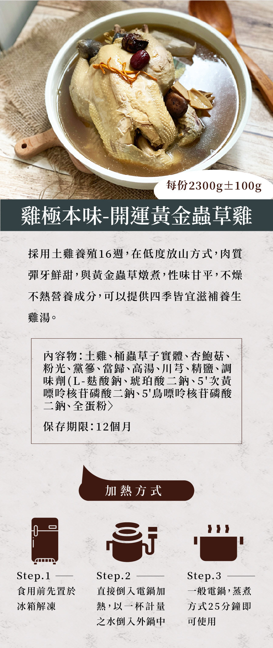 成分 : 土雞、桶蟲草子實體、杏鮑菇、粉光、黨篸、當歸、高湯、川芎、精鹽、調味劑(L-麩酸鈉、琥珀酸二鈉、5'次黃嘌呤核苷磷酸二鈉、5'鳥嘌呤核苷磷酸二鈉、全蛋粉〉