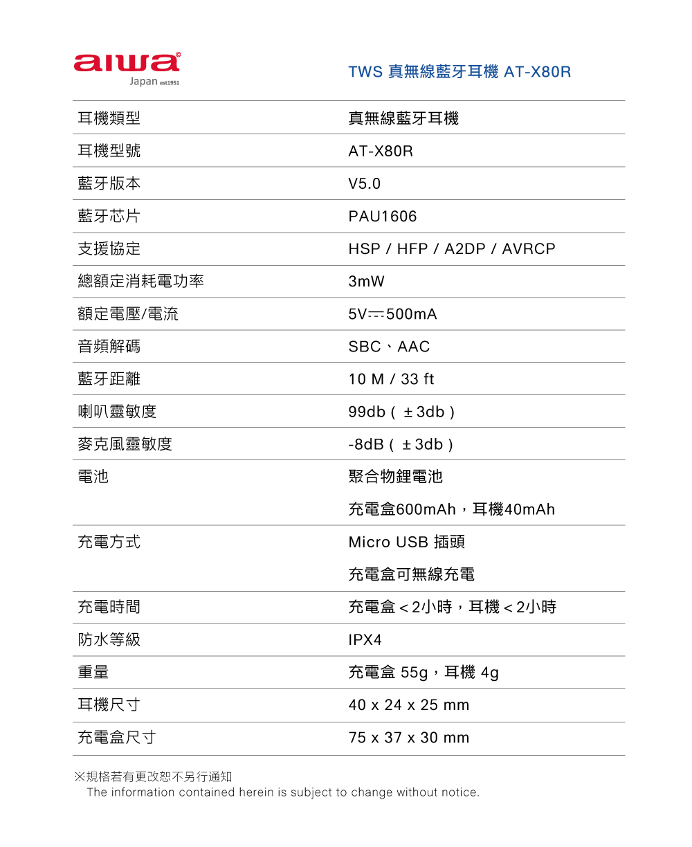充電時間: 充電盒<2小時,耳機<2小時