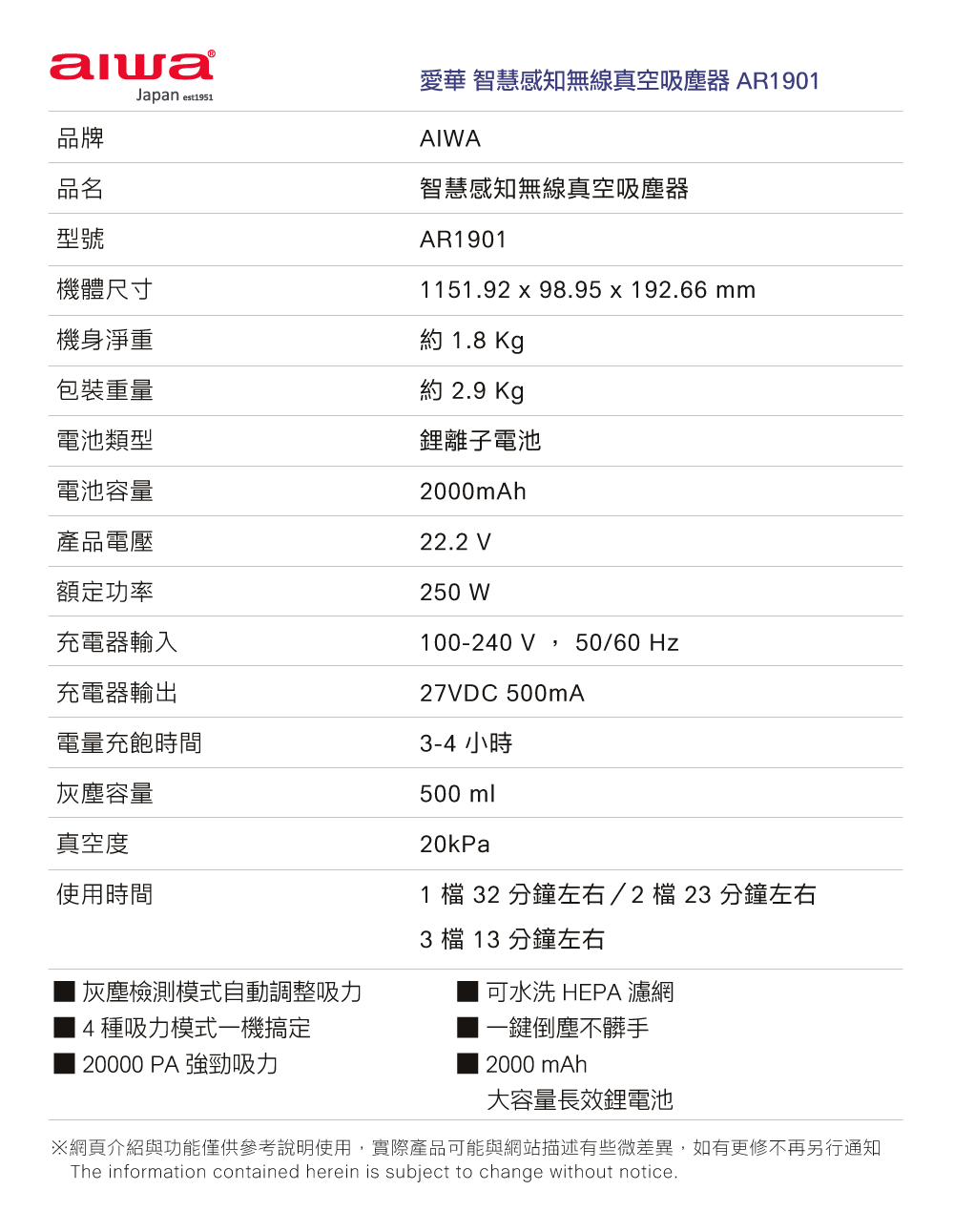 品名:AIWA 愛華 智慧感知無線真空吸塵器