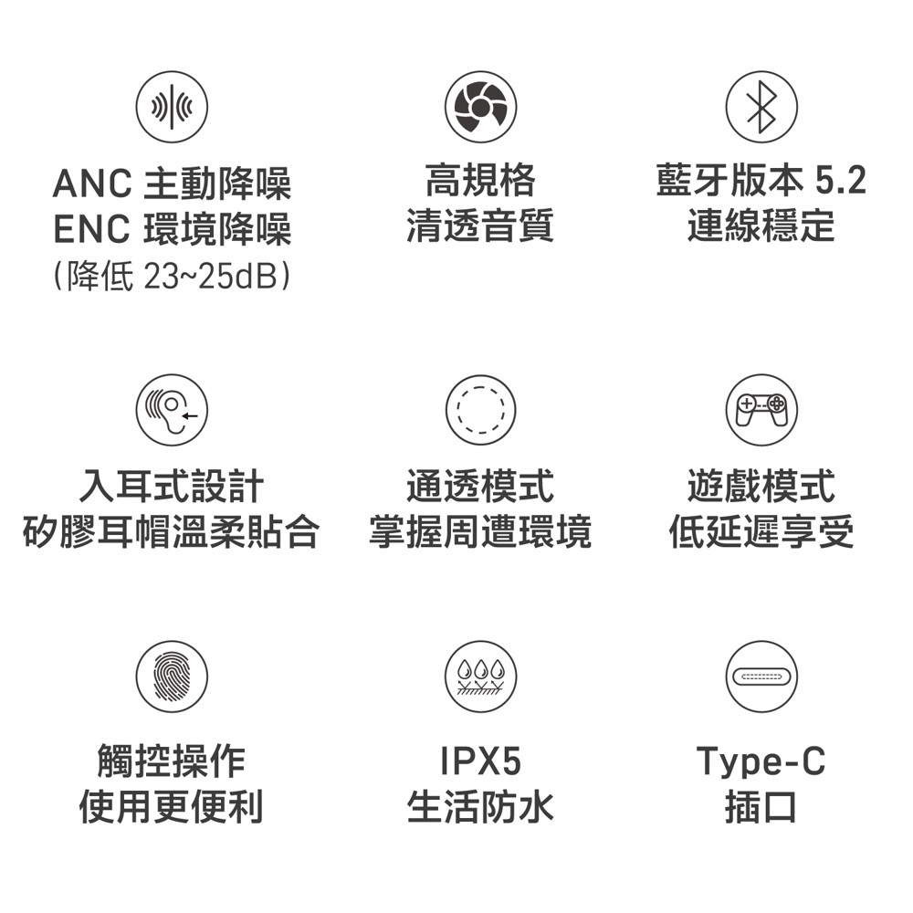 .ANC 主動降噪 + ENC 環境降噪 (降低 23-25dB)