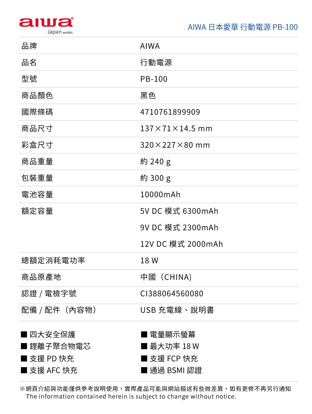 .額定容量 : 5VDC模式 6300mAh | 9VDC模式 2300mAh | 12VDC模式 2000mAh