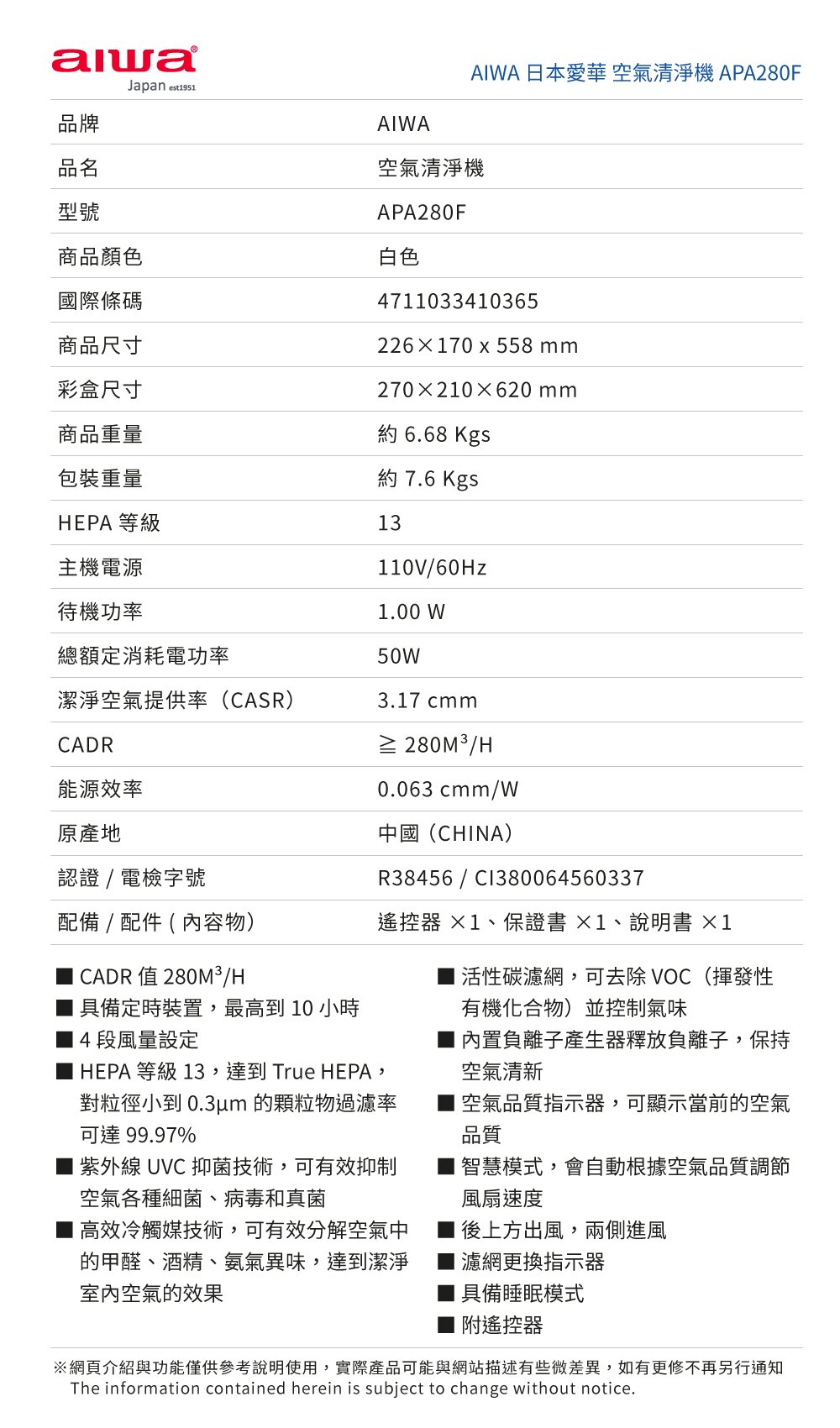 品名:AIWA 愛華 負離子定時空氣清淨機