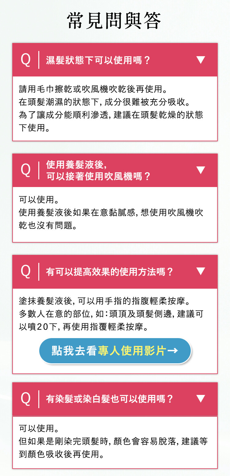 使用方式:噴適量於頭皮後,用指腹輕揉按摩。