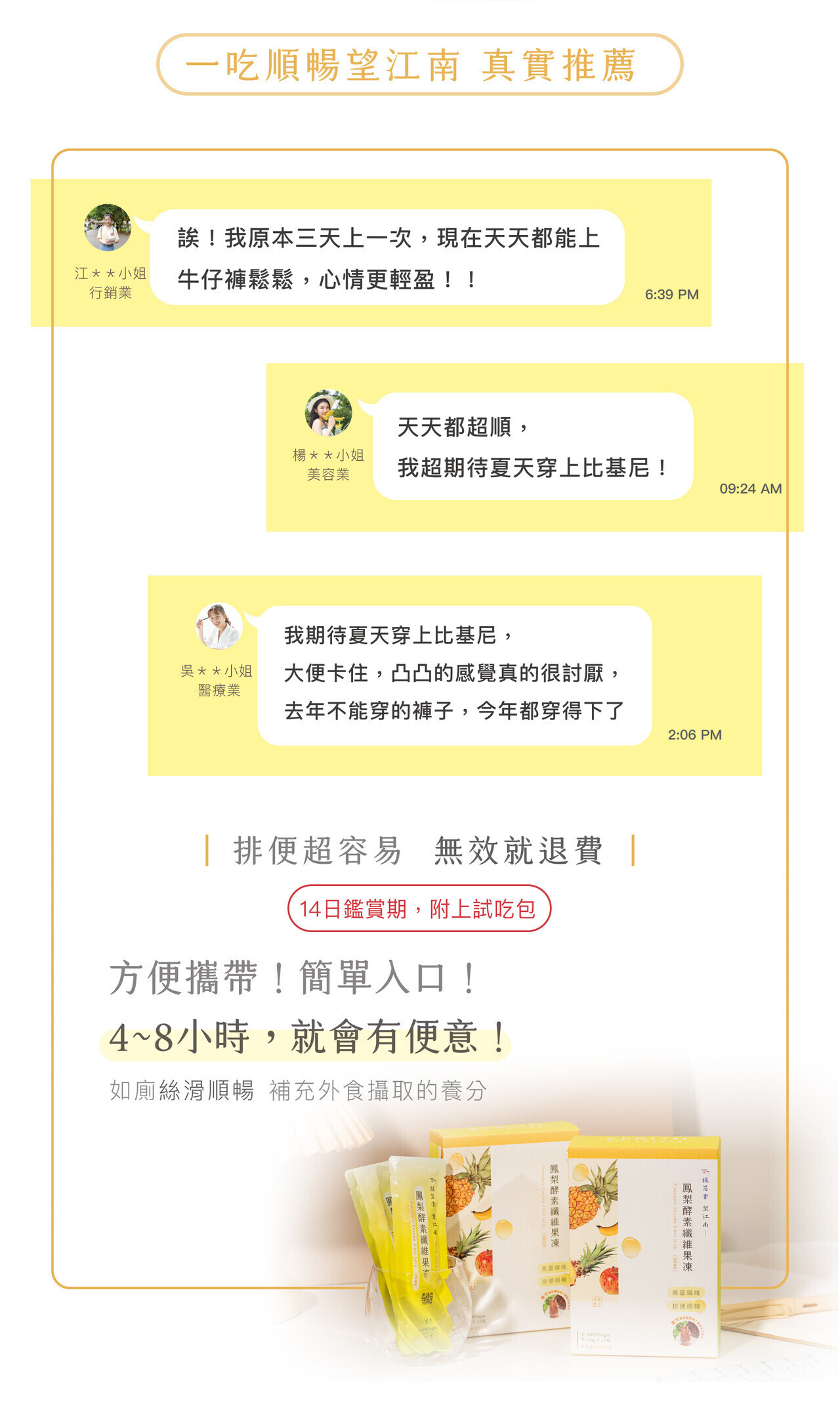 針對外食飲食不均衡,天天順暢設計的果凍,以保養品起家,產品以美容為出發點作為研發,營養的平衡與補充,搭配保養品增加3倍的效率