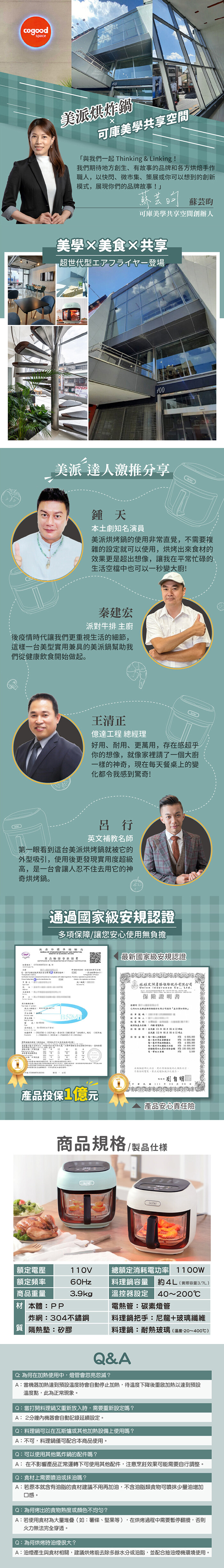 .材質:本體-PP/炸網-304不鏽鋼/隔熱墊-矽膠/電熱管-碳素燈管/料理鍋把手-尼龍+玻璃纖維/料理鍋-耐熱玻璃(溫度-20℃~400℃)