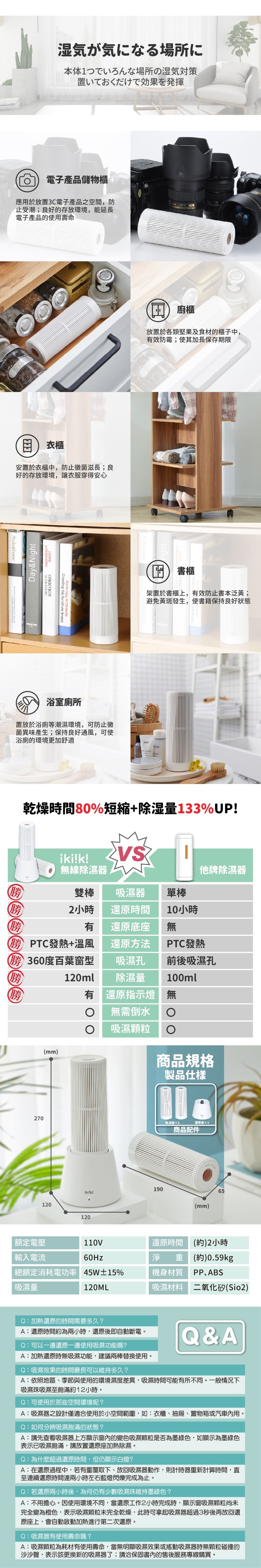.商品尺寸/淨重:吸濕器+還原座-約W120xD120xH270mm/約0.59kg;吸濕器-約65x190mm