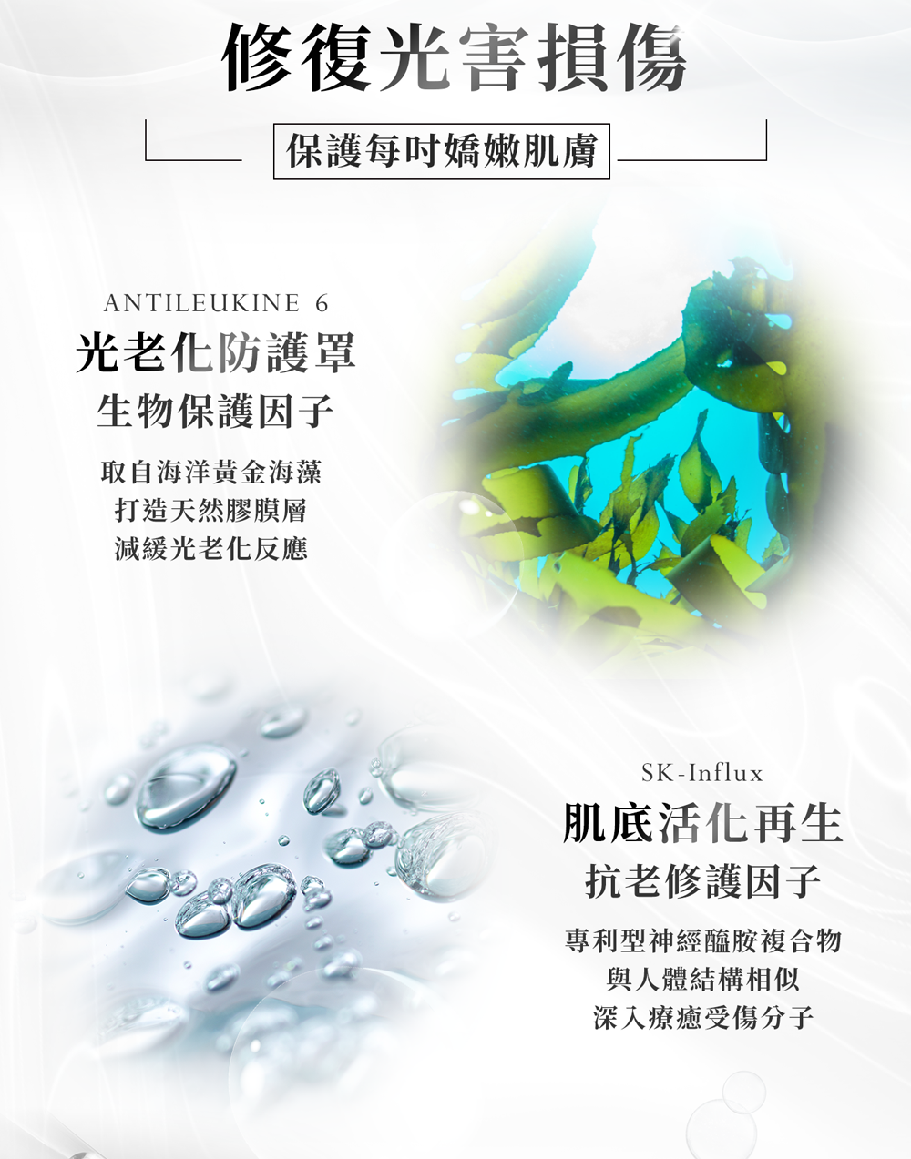 複合神經醯胺(1+3+6)•活化滋養使肌膚維持水分,提升肌膚對環境傷害保護力。