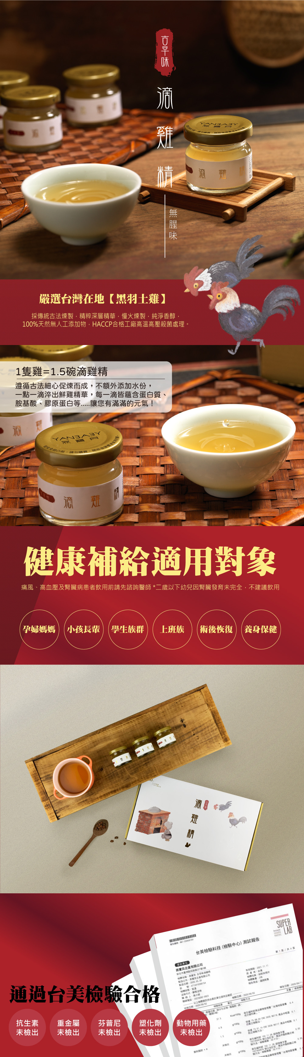 部份不肖業者為了讓消費者取信會在滴雞精中加入添加物,混謠視聽滴雞精色澤愈深口感愈濃郁,這其實是錯誤謬論,真正好的滴雞精,成份單純無人工添加,顏色清澈味道鮮純,讓您吃進健康不吃負擔。