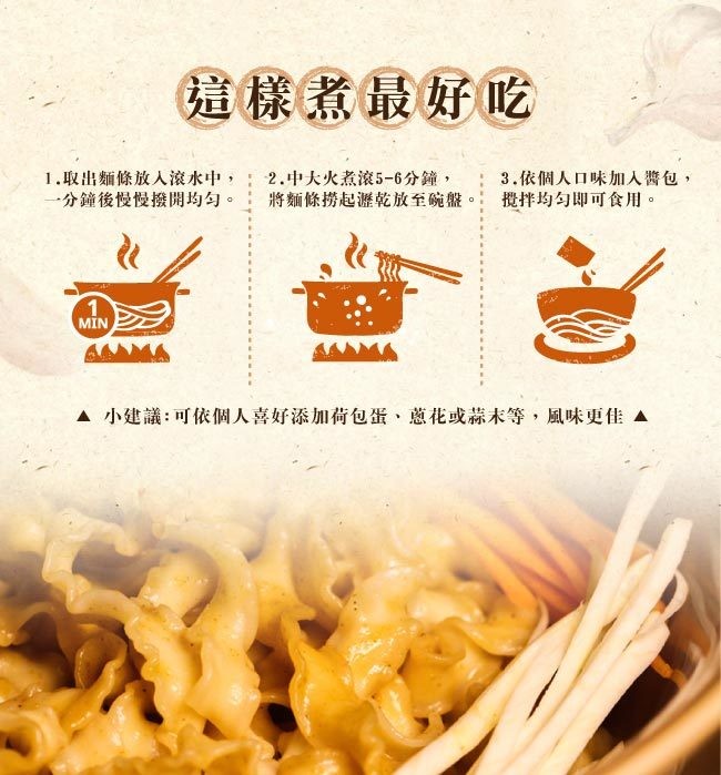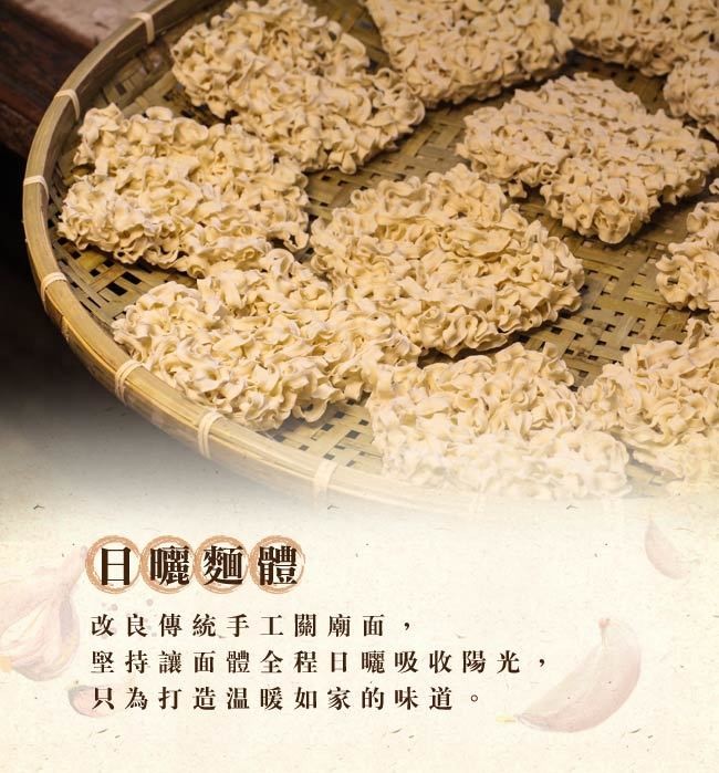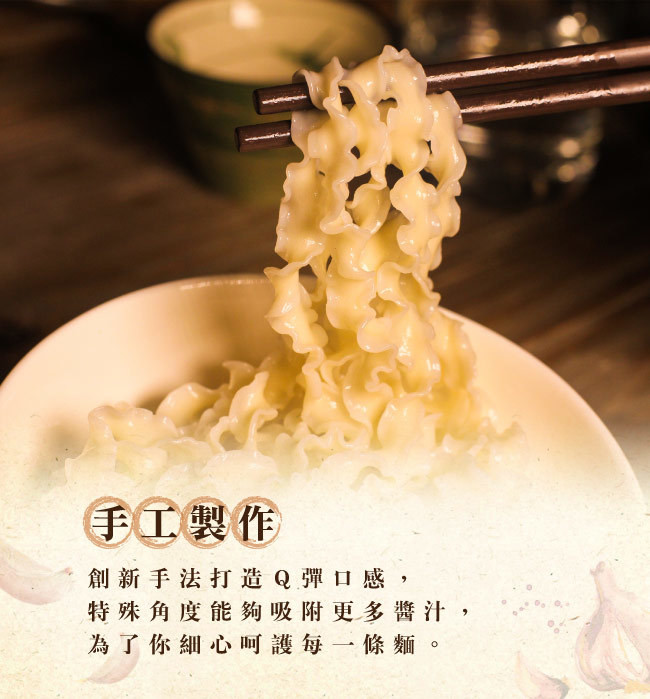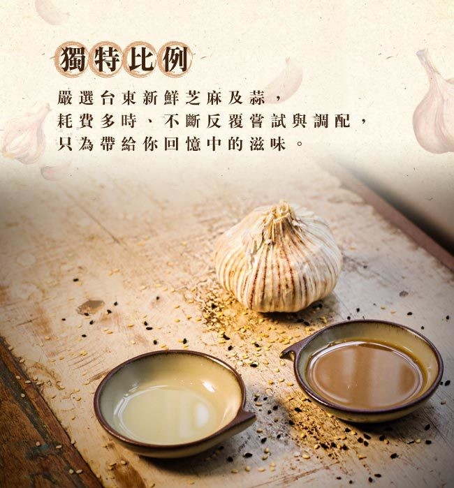 蒜香麻醬選用台東芝麻,多道工法精粹提煉製成,香氣濃郁。而濃烈的芝麻香氣中和蒜頭的辛辣感,加上風味香醇的純釀造醬油,相互結合成完美的拌麵醬,淋上Q彈有嚼勁的麵條。吃一口,在舌尖上交織出暖暖的家鄉味。