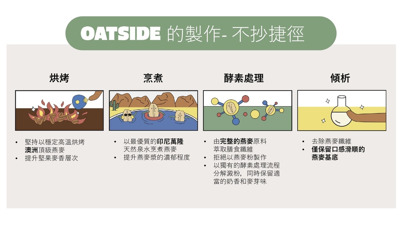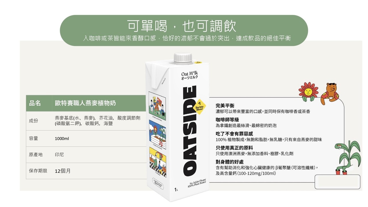 OATSIDE 燕麥奶 是2023年最值得嘗試的植物奶! OATSIDE是新加坡品牌,工廠位於空氣清新,無污染的印尼爪哇島萬隆山區。不油膩,濃郁卻不會跟咖啡/茶搶味。OATSIDE採用西澳洲最高級的燕麥,燕麥經火烤不水蒸,才能讓燕麥發揮天然的麥芽香氣和堅果風味。
