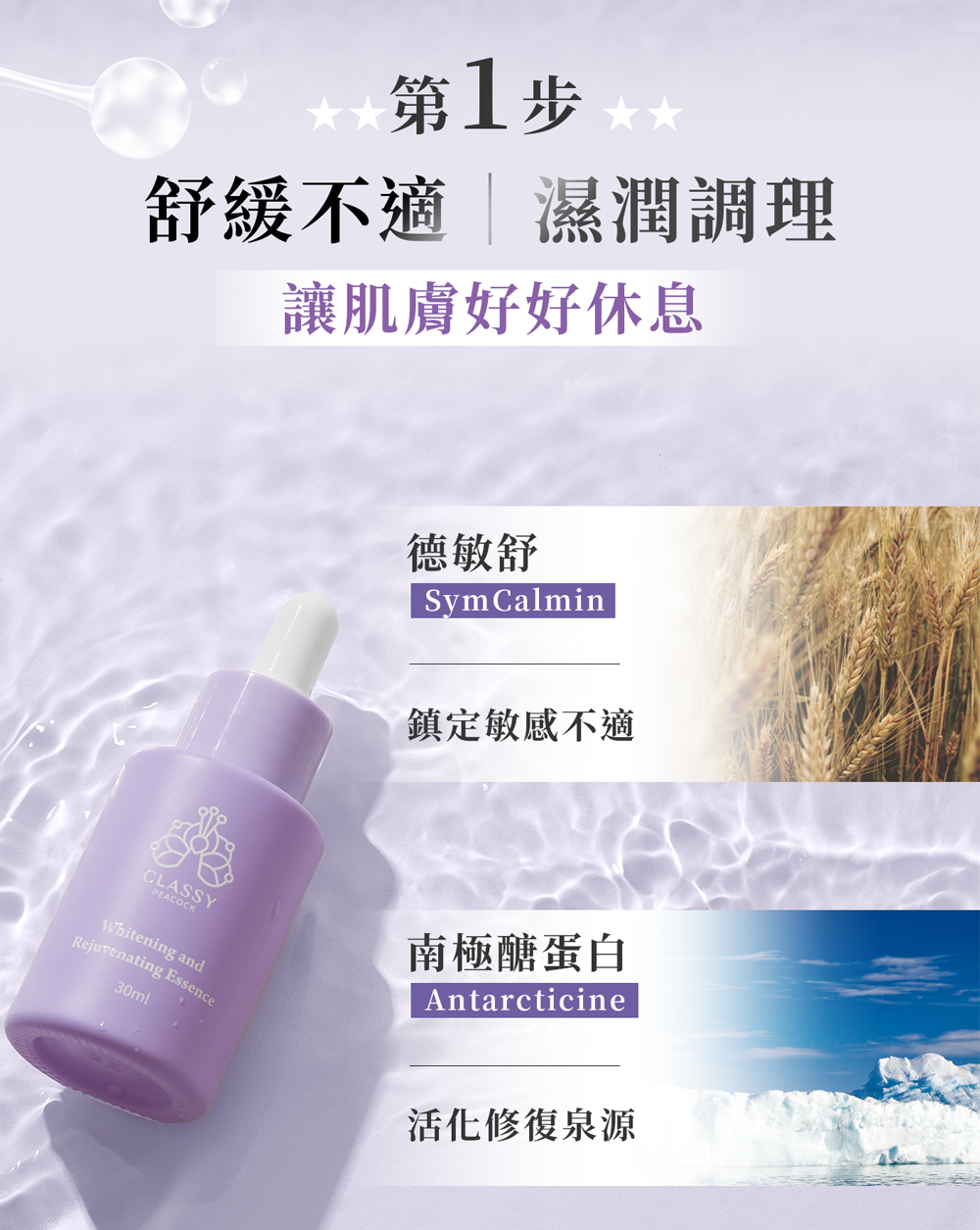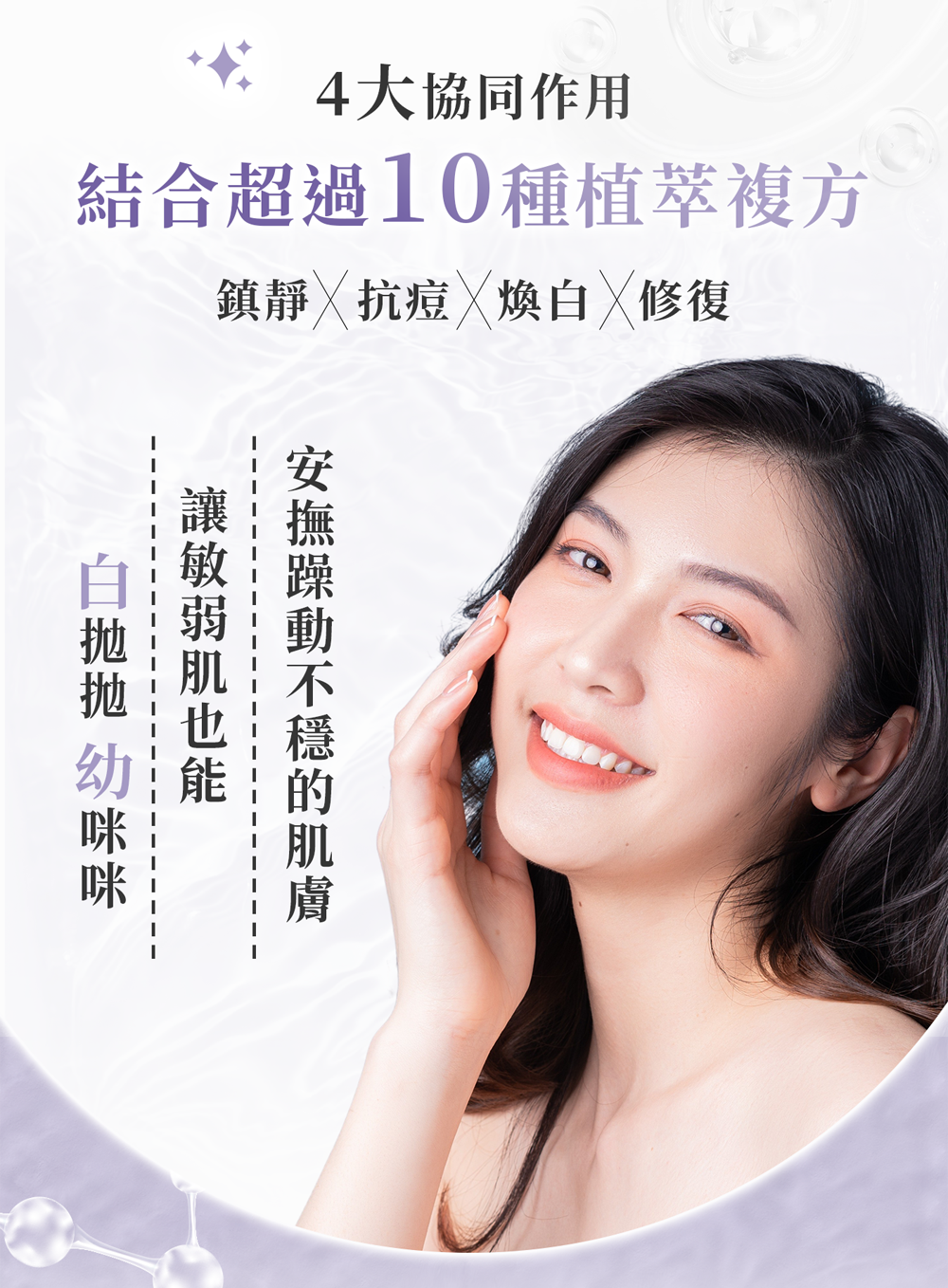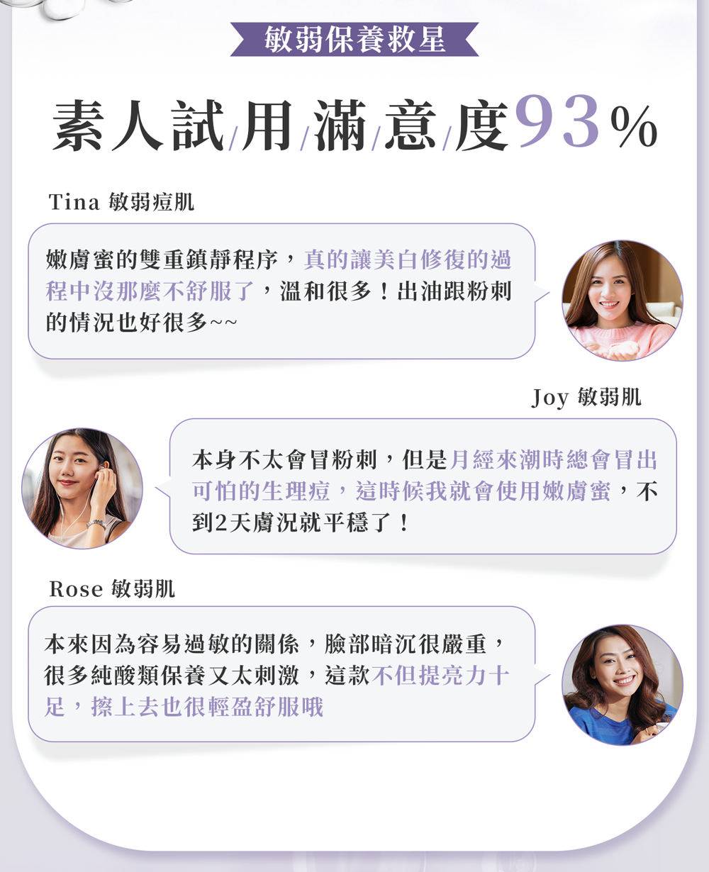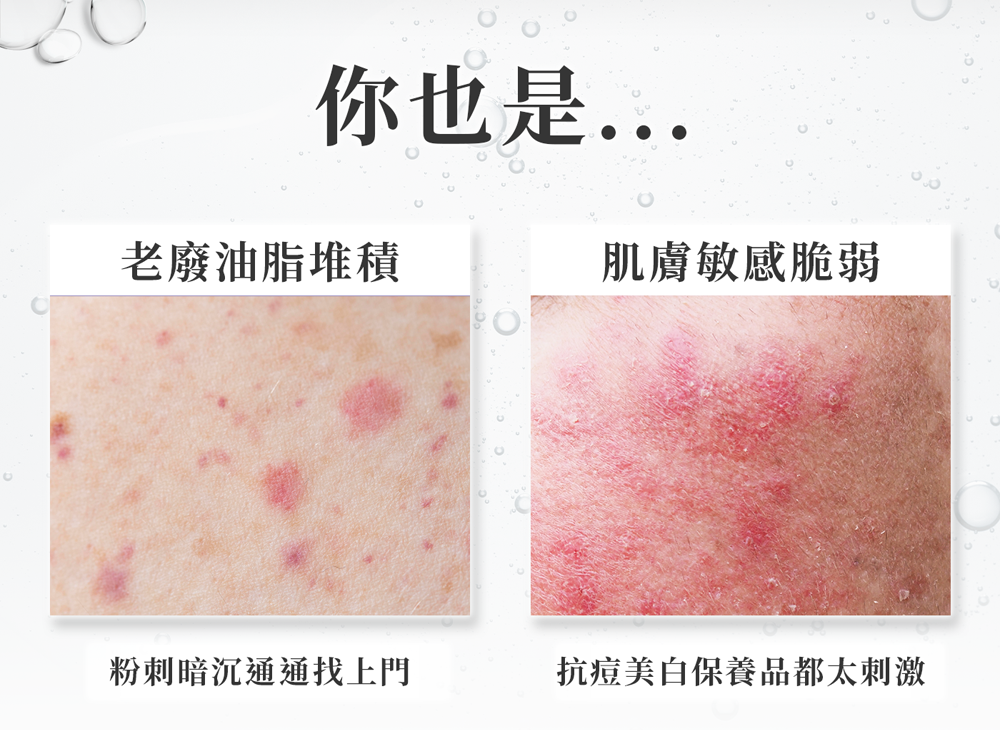 抗痘:舒緩修護,安撫肌膚不適,改養暗沈使肌膚透亮光澤。