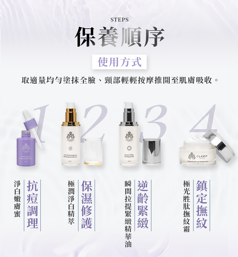 使用方法:早晚臉部清潔後,取適量輕抹於臉部,先以指腹輕拍,再塗抹開,讓產品吸收即可。