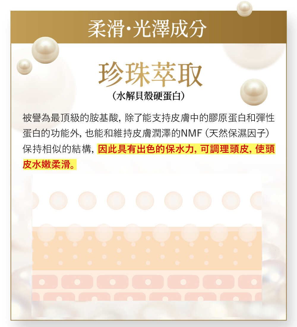2.珍珠萃取具有出色的保水力!可調理頭皮,使頭皮水嫩柔順