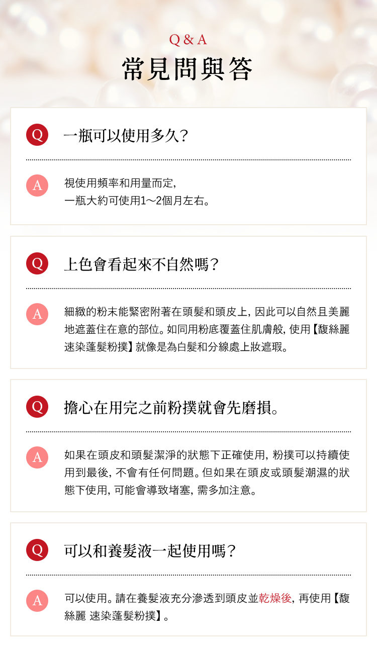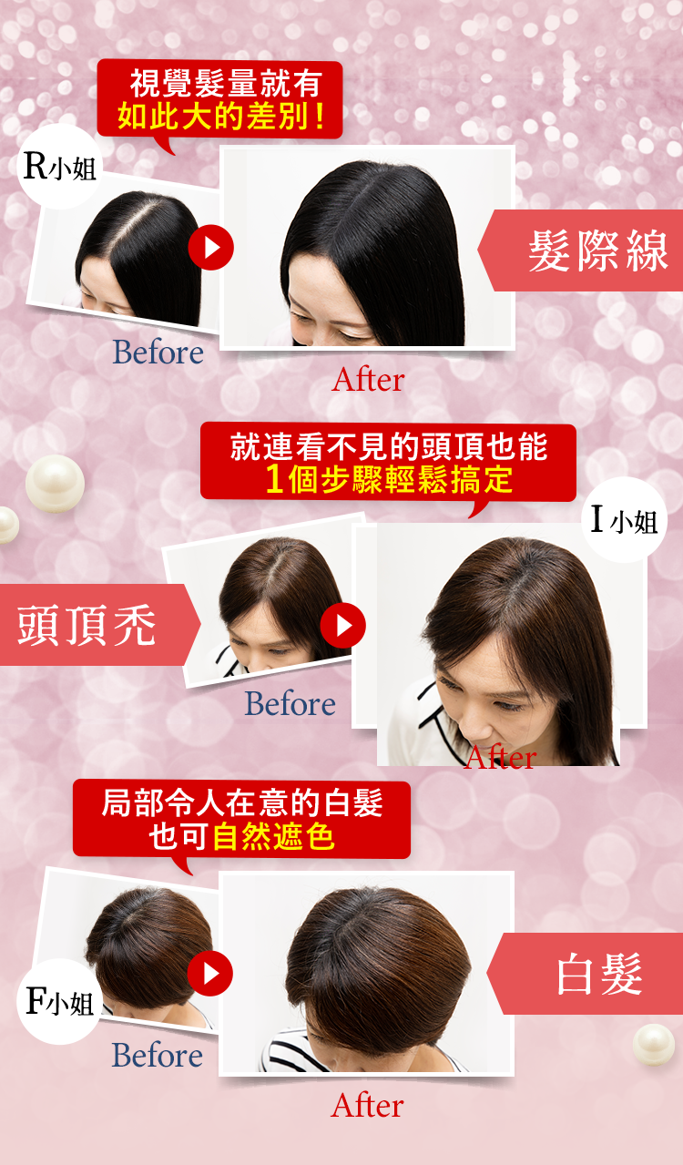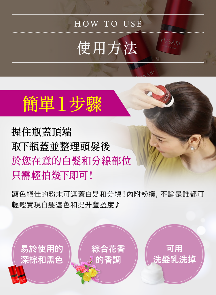 使用方式:乾髮時使用,用粉撲輕輕拍在在意的部位。